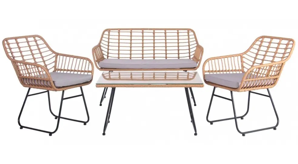Комплект Латіно – чудовий варіант для літньої тераси. Комплект складається з двох крісел, двомісного диванчика та кавового столика. Каркаси виробів виготовлені з металу та покриті порошковою фарбою. Сидіння та спинка виробів виконані з ротанга, який створює повітряне невагоме плетіння та не перешкоджає циркуляції повітря у спекотні дні. Додатково є подушки на сидінні дивана та крісел, які забезпечать максимальний комфорт. Стільниця столика виконана з гартованого скла, товщиною 5 мм. Комплект Латіно стане вашим незамінним помічником під час щоденного ранкового чаювання.